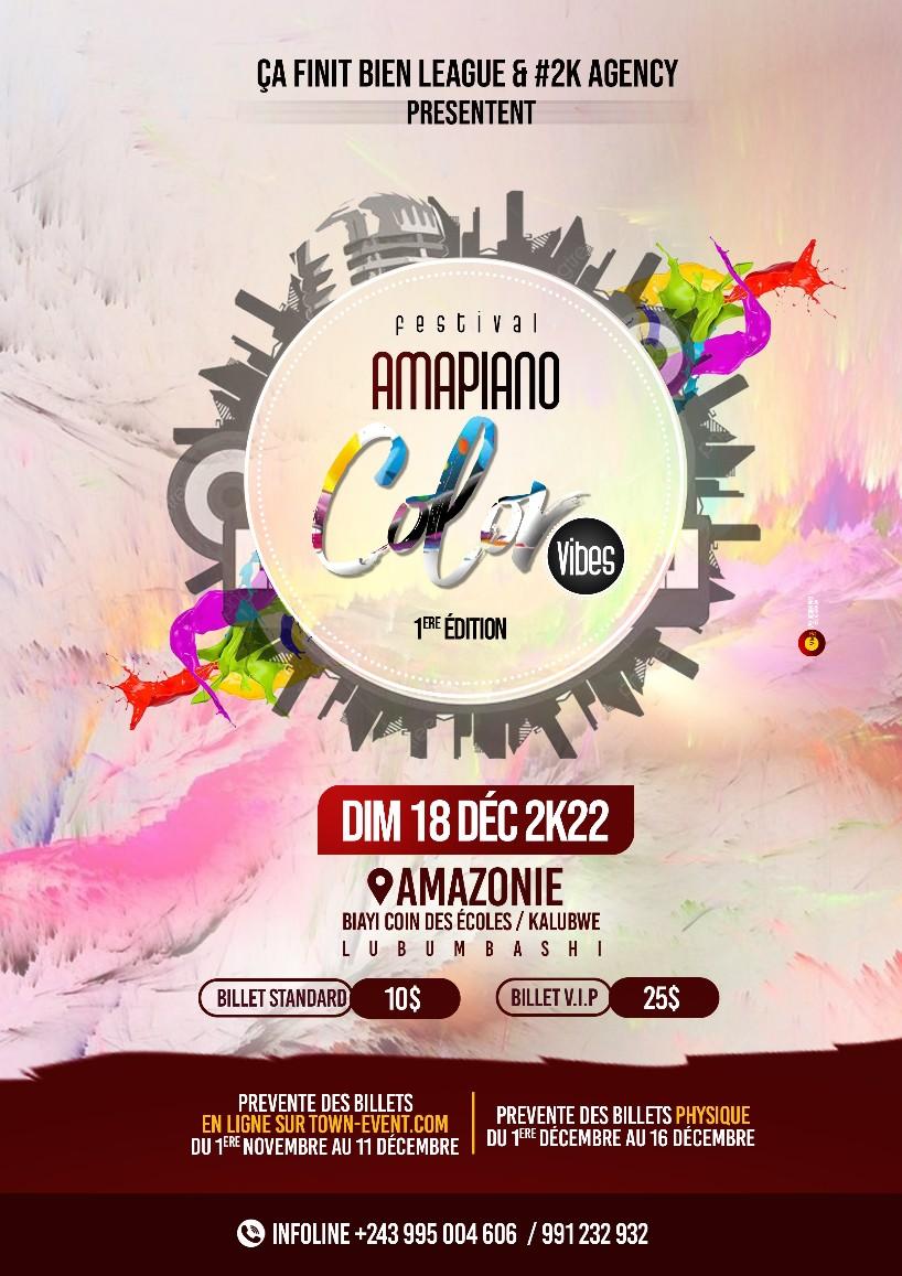 Hey! Lubumbashi FESTIVAL AMAPIANO VIBES COLOR 2K22 Venez vivre une expérience hors du commun avec nous... Il y'aura beaucoup des surprises et tant d'autres Donc pour tout LUBUMBASHI et ces environs le rendez-vous est pour ce 18 décembre 2022 à l'espace AMAZONIE sur l'avenue biayi coin des écoles, Quartier kalubwe Lubumbashi