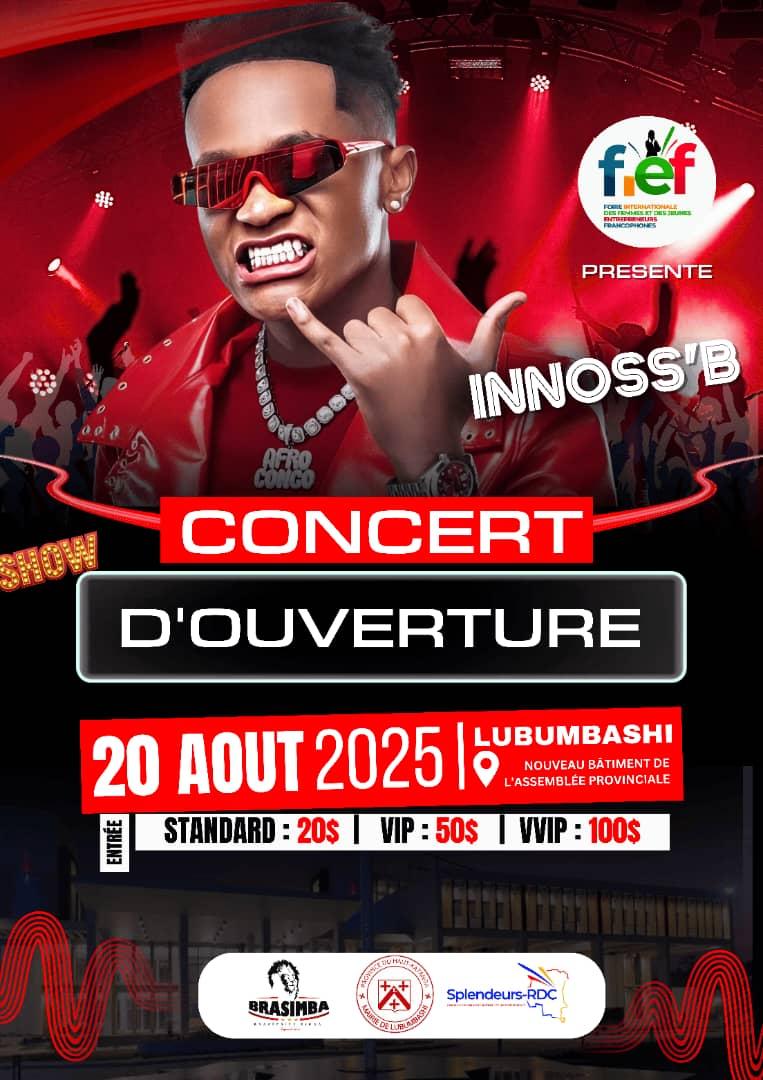Du 20 août au 05 septembre 2025, Vivez la Foire Internationale de Femmes et des Jeunes Entrepreneurs Francophones à lubumbashi-rdc CONCERT D'OUVERTURE GRAND PUBLIC AVEC INNOS'B Avec la Fief-Expo-rdc, Lubumbashi devient le plus grand rendez-vous annuel des entrepreneurs de l'espace francophone. La FIEF - Expo- 4eme édition C'est - 200 exposants venus de différents pays et des 26 provinces de la RDC - 10.000 visiteurs - 1 Parc d'attraction et kermesse exclusivement BRASIMBA - 10 restaurants vip - 1 Défilé de mode dedidé à Didi-Stone Olomide avec des stylistes venus de la France, du Tchad, du Sénégal, de la Guinée Bissau, de la côte d'ivoire, du Cameroun et de Kinshasa. Infolines +243971818901