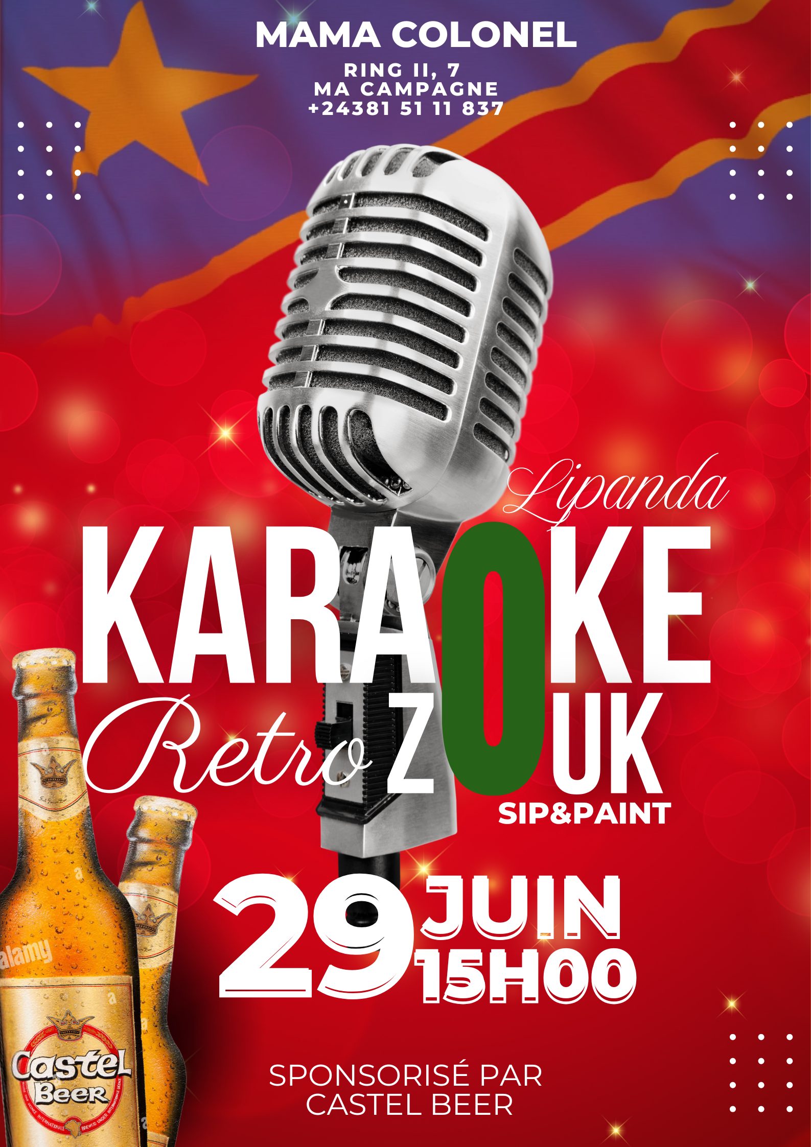 Rejoins-nous le samedi 29 juin à 15h pour une après-midi inoubliable au cœur de Kinshasa ! Ambiance rétro, vibes zouk, poulet ou poisson braisé au feu de bois, boissons bien fraîches et une session Sip & Paint pour libérer ta créativité. 🔥 Au programme : 🎶 Karaoké rétro & Zouk 🎨 Atelier peinture en musique (Sip & Paint) 🍗 Grillades Mama Colonel 🍻 Castel Beer offerte à l’arrivée