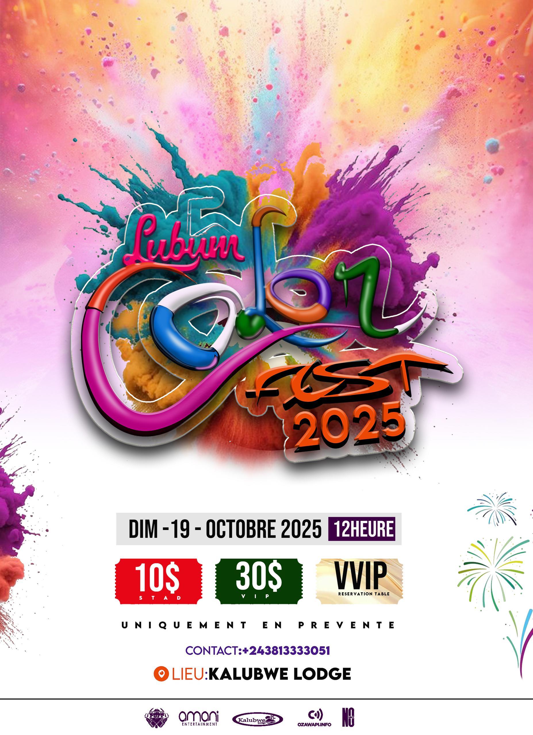 🎉 Lubum Color Fest 2025 – La fête des couleurs arrive à Lubumbashi ! 🌈🔥 La billetterie est OUVERTE 🎟️ 👉 Réservez vos places dès maintenant sur www.town-event.com et profitez de la prévente exclusive 💻✨ 📅 Dimanche 05 Octobre 2025 – 12h 📍 Kalubwe Lodge 💸 Tarifs : 10$ (Stand) | 30$ (VIP) | VVIP (Table réservée) Ne ratez pas l’événement le plus coloré de l’année 🌟💃🕺 #LubumColorFest2025 #TownEvent #BilletterieEnLigne