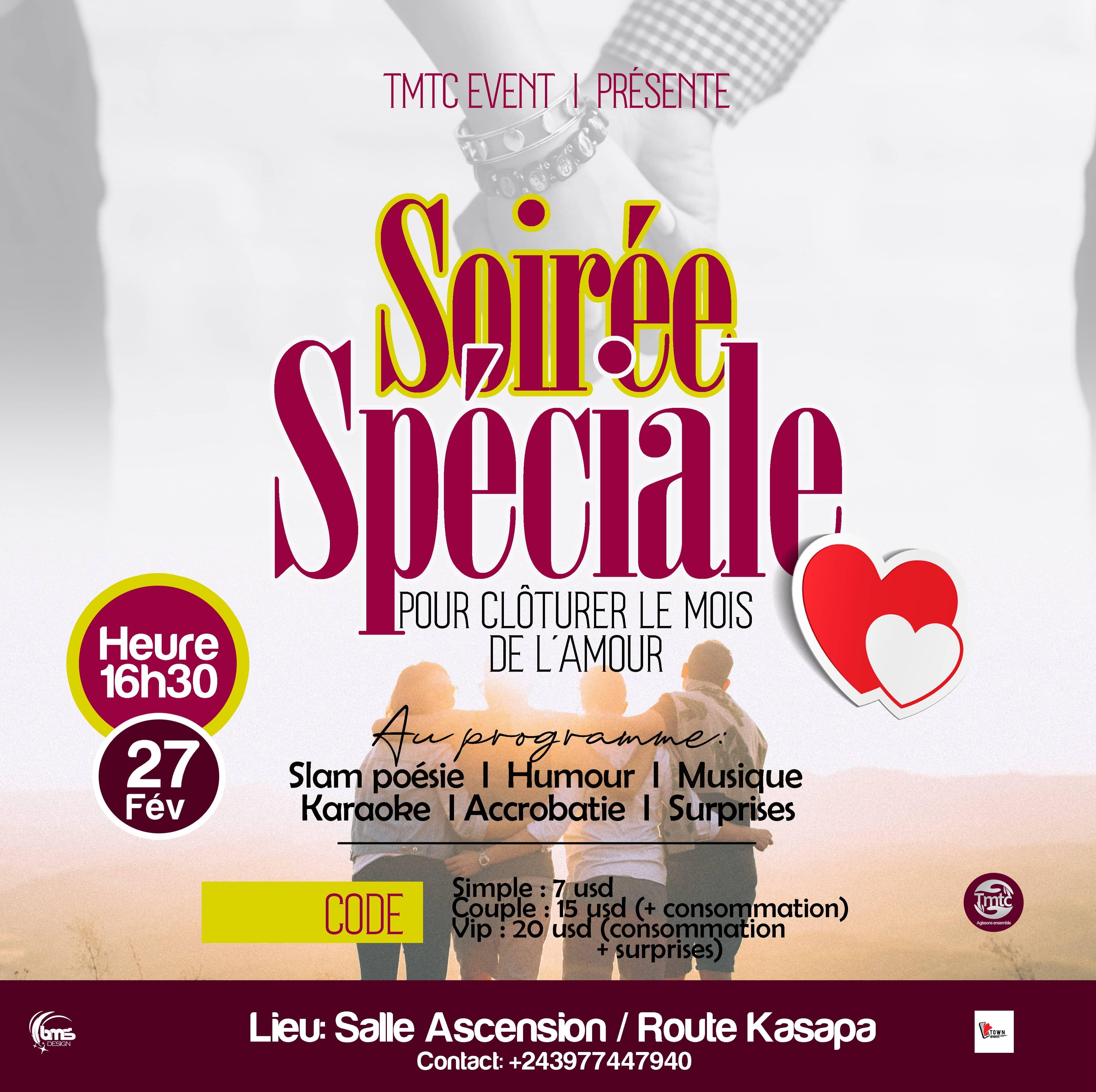 | Prix du billet : | Simple fc 14000 Franc congolais SIMPLE DOL 7 Dollars COUPLE FC 30000 Franc congolais COUPLE DOL 15 Dollars VIP FC 40000 Franc congolais VIP DOL 20 Dollars | |